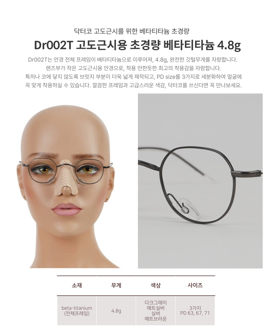 Dr002T는 닥터코안경의 [고도근시를 위한] 풀프레임 베타티타늄-하이엔드 제품입니다.