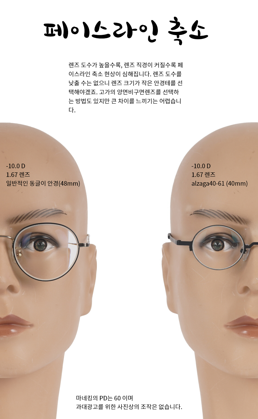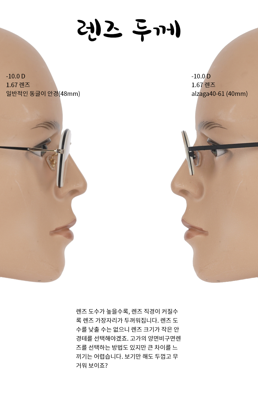 고도근시분들은 무조건 비싼 렌즈, 압축렌즈를 사용하셔야하는데 Alzaga라인의 경우는 렌즈 크기가 작아 주변부시야 왜곡현상이 줄어들기 때문에 전혀 상관이 없습니다. (실제 고도근시의 경우, 500원짜리 동전크기의 렌즈로 안경을 만든다해도 크게 시야에 방해를 받지는 않습니다. 고도근시의 경우 굴절효과로 인하여 안경알이 작아도 시야가 좁아짐을 느끼지 못하기 때문이지요.)