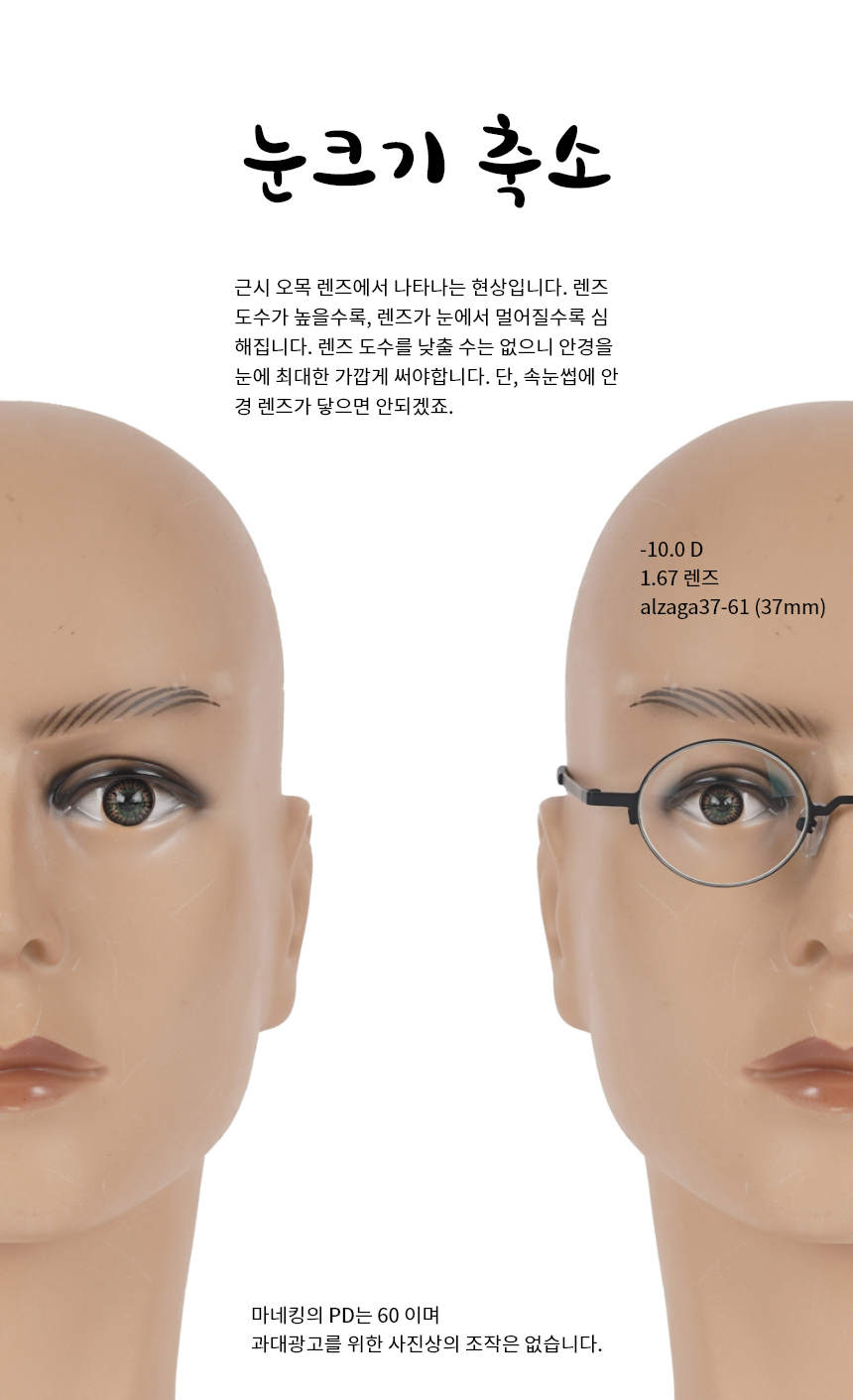 두 안경에 똑같이 -10디옵터의 고도근시 렌즈를 착용시켰을때의 사진입니다.